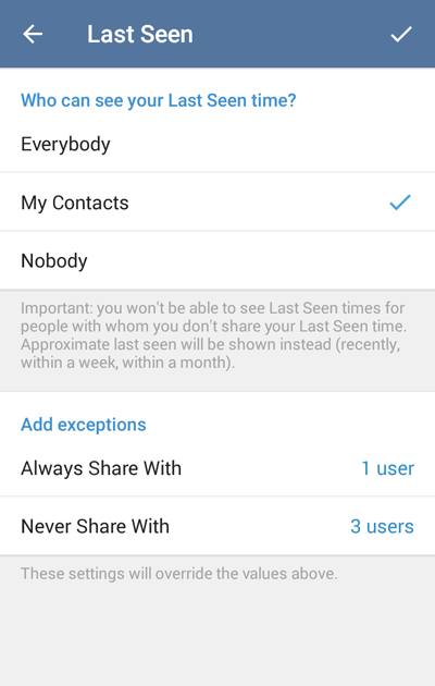 We take privacy very seriously, so we invested a lot of time and effort to make this feature right. As a result, the Who can see your Last Seen time control allows unprecedented precision and flexibility.