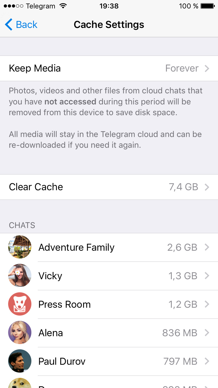 On iOS it is also possible to clear cached files on a chat-by-chat basis. On Android, this currently works with supergroups and channels (just tap and hold in the chats list, then ‘Delete from Cache’).