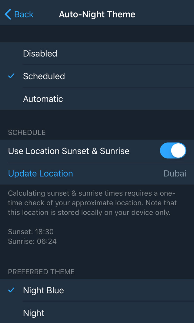 Telegram for iOS v.4.8 also includes some of the goodies which Android users have been enjoying since the previous release. With Auto-Night Mode settings you can automatically switch to the dark version of the interface after nightfall or in low-light conditions:
