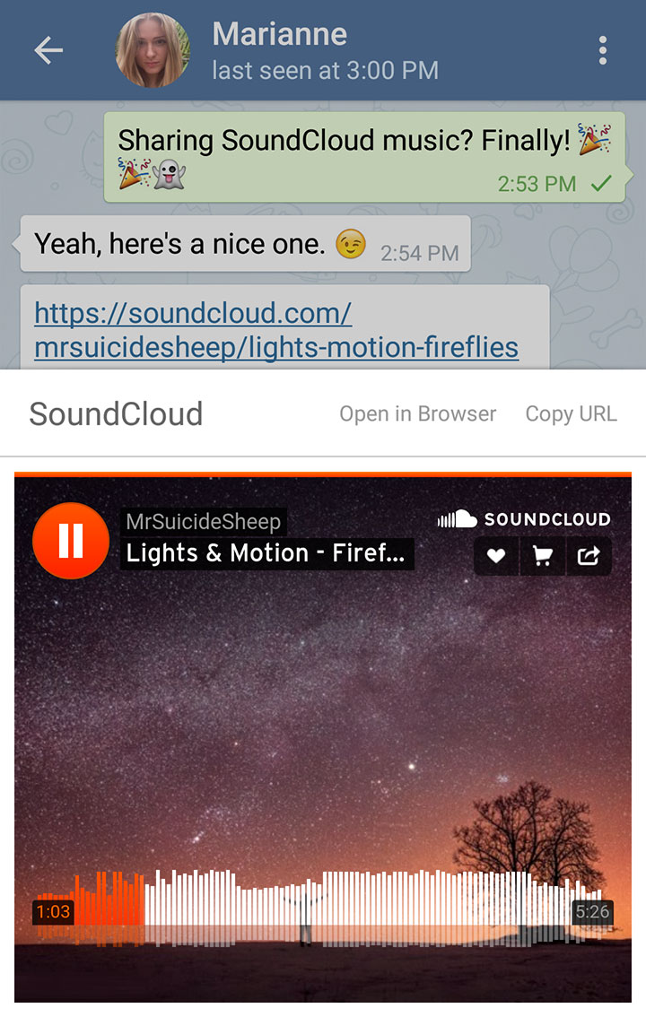 The new version of Telegram allows you to play media from services like YouTube, Vimeo or SoundCloud directly from Telegram – without having to leave the app. Just tap on the preview of a link to an external media to view the video or listen to the audio file (speaking of audio files, they are now beautifully rendered and played in chats).
