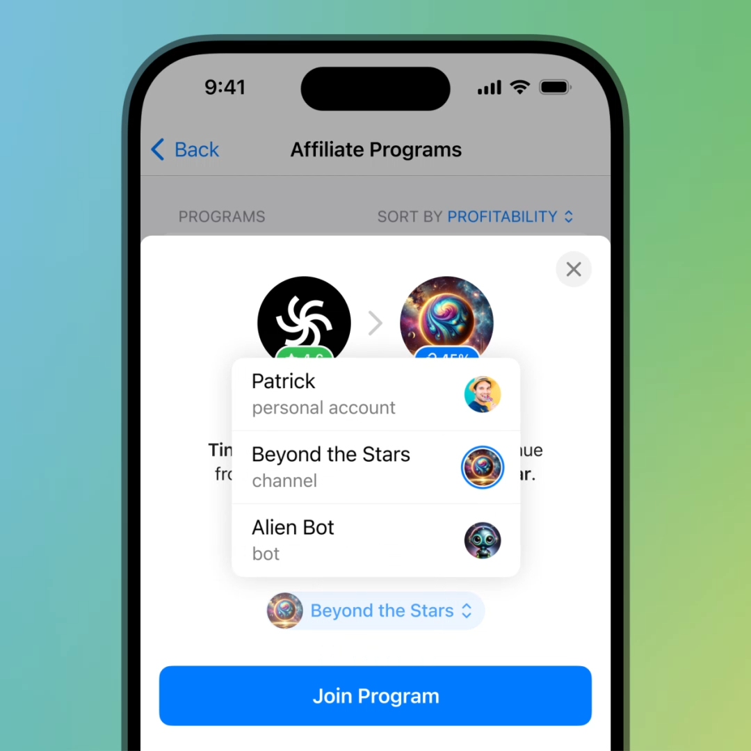 Telegram users are able to browse a list of active affiliate programs from their Star balance in Settings > My Stars. There they can sort programs by their start date, total revenue or potential profit and join any program they wish. There are no limits on the number of programs a user can join.